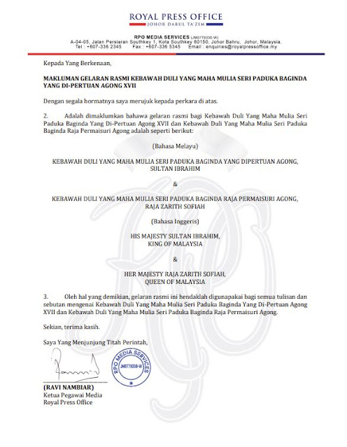 Oleh hal yang demikian, gelaran rasmi ini hendaklah digunapakai bagi semua tulisan dan sebutan mengenai Kebawah Duli Yang Maha Mulia Seri Paduka Baginda Yang Di-Pertuan Agong XVII dan Kebawah Duli Yang Maha Mulia Seri Paduka Baginda Raja Permaisuri Agong.